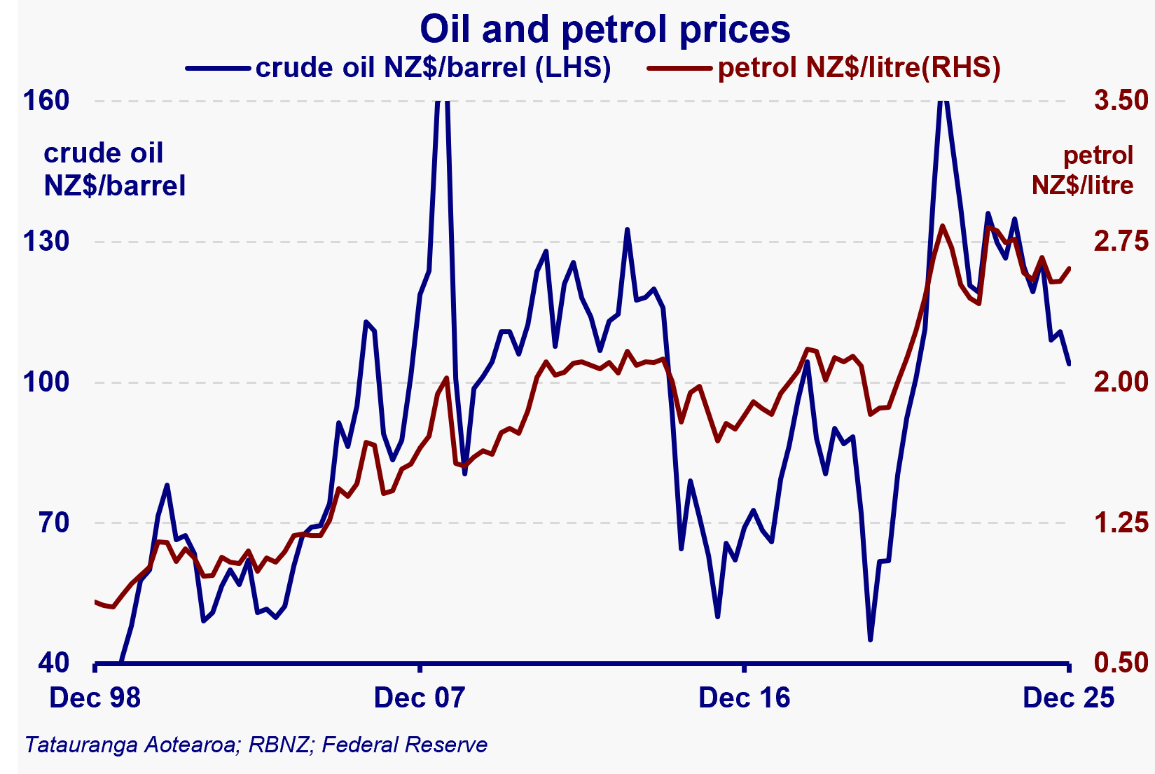 For example, and as noted above, the 24 March 2026 situation comprised the price of crude at around US$100/barrel and an exchange rate of NZ$1=US$0.588 translating to the price of crude being NZ$170/barrel. The average relationship suggests a retail price of petrol for 24 March 2026 would be close to NZ$2.86/litre - indeed almost identical to the June 2022 dot in the chart5.